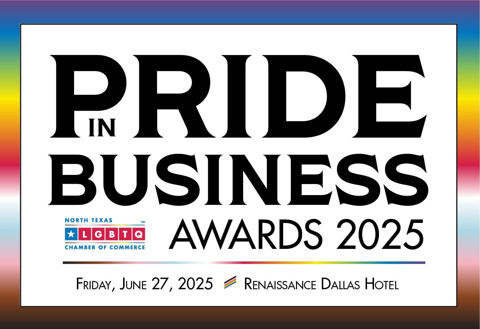 The North Texas LGBT Chamber of Commerce will host its signature awards program, Pride In Business Celebration & Awards luncheon, on June 27, 2025, 11:00 a.m. - 1:30 p.m. at the Renaissance Dallas Hotel. The program will recognize our eleven Pride In Business Celebration honorees.